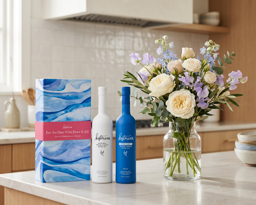 Kosterina ultra premium extra virgin olive oil is made from 100% Koroneiki Olives, cold pressed and harvested early in southern Greece. The result is a flavorful and incredibly healthy EVOO that stands out from the rest.