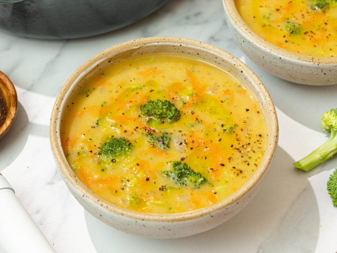 Add the chopped broccoli, grated carrots, bone broth, salt, and pepper. Stir and bring to a simmer. Cover and reduce the heat to medium-low and cook for about 15-20 minutes or until the vegetables are tender.