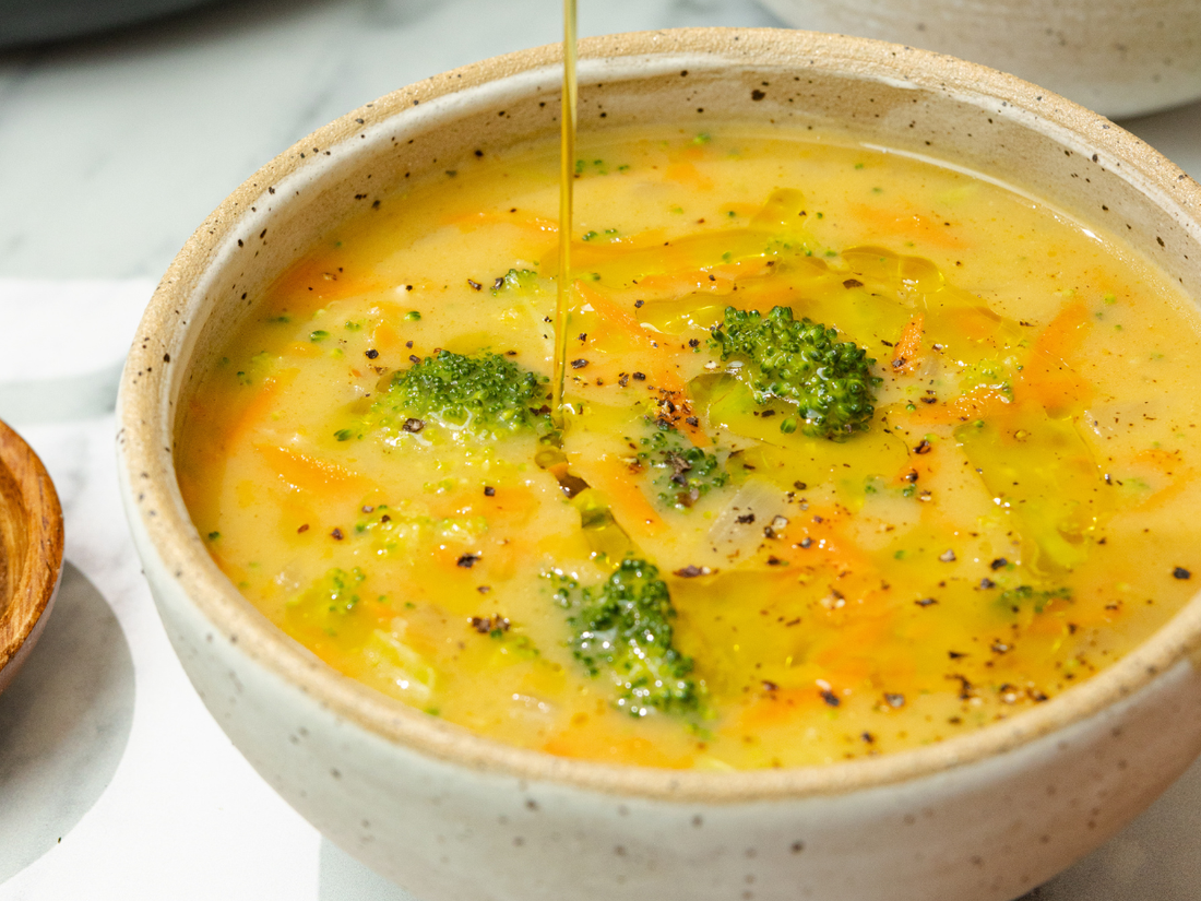 Once the vegetables are tender in the soup, remove from the heat and pour in the blended cauliflower mixture and the cheese. Stir until everything is combined and the cheese is fully melted. Taste and add more salt and pepper if desired.