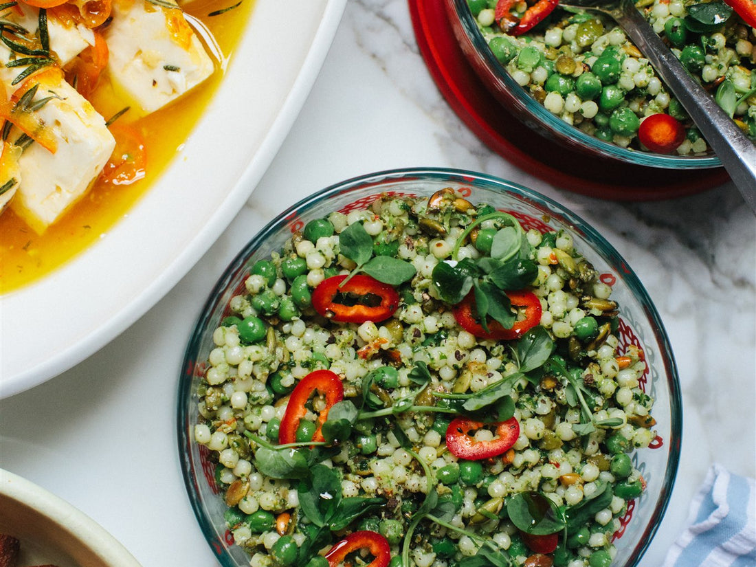 In the bowl with couscous & peas, add remaining ½ cup pepitas & minced Fresno. Dress with sauce to taste &transfer to a shallow bowl. Garnish with pea tendrils, pepitas & fresno rings.