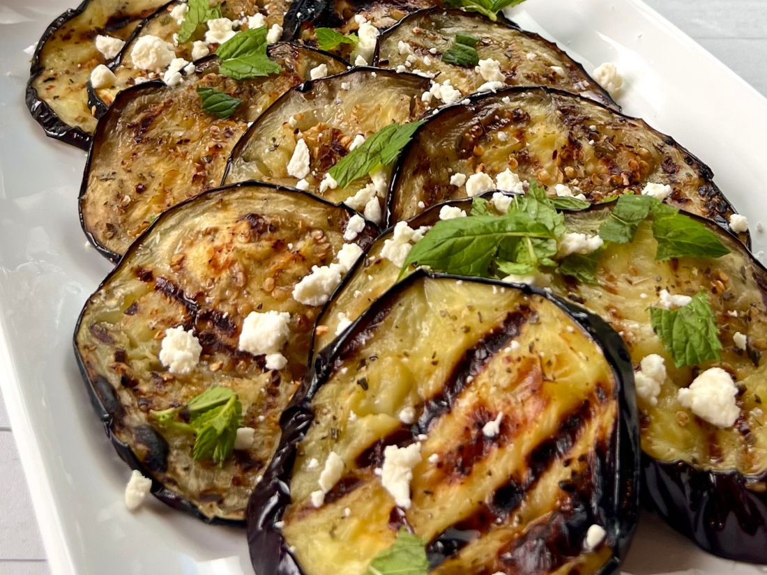 Top grilled eggplants with feta and parsley, then squeeze lemon juice over.