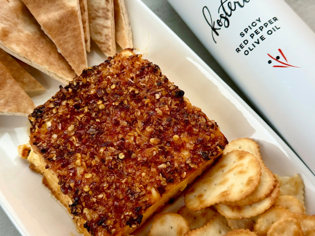 On a parchment lined baking sheet, place block of Feta in the middle of the baking sheet. Top with Chili Onion Crunch and drizzle EVOO and Hot Honey on top.