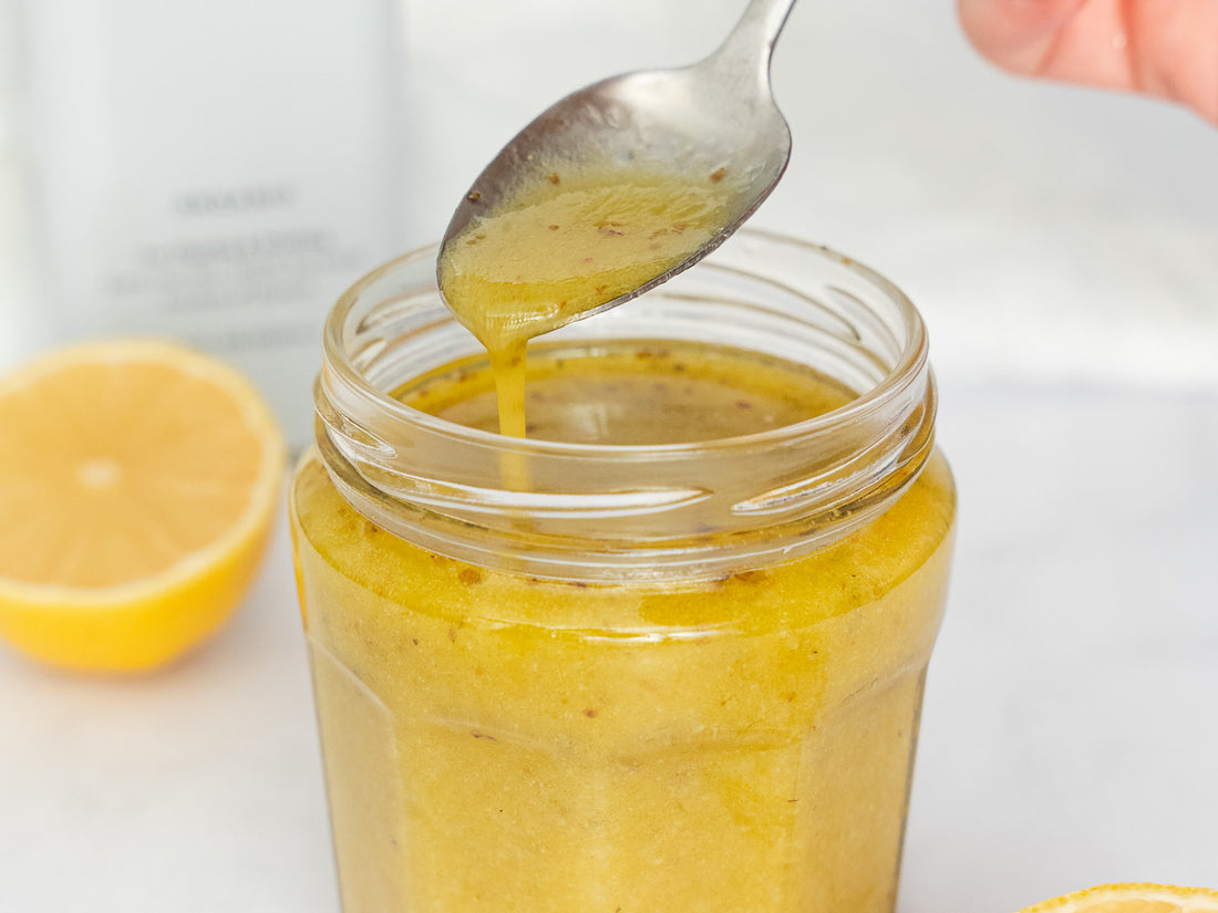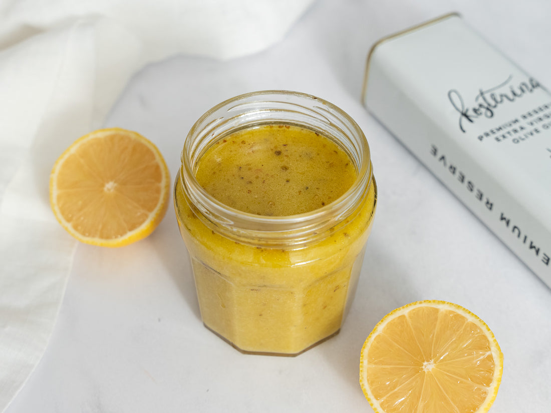 In a medium bowl, whisk together the lemon juice, lemon zest, garlic, mustard, oregano, salt until thoroughly combined. Slowly drizzle in the Kosterina extra virgin olive oil, whisking constantly until thoroughly incorporated. Store, tightly covered in a glass container at room temperature for a day or in the refrigerator for up to 2 weeks.
