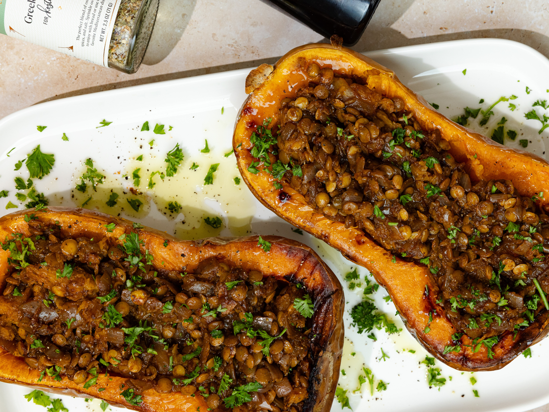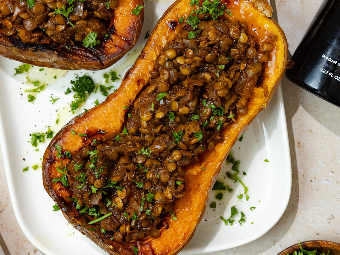 Add the scooped out squash into the lentil mixture and stir to combine. Taste and add more salt and pepper if desired.