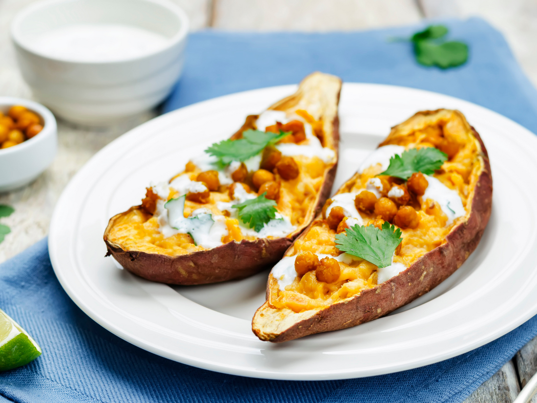Once Sweet Potatoes are out of the oven, cut them in half and use the back of a spoon to push down the middle of the potato to mimic a bowl to fill with your spinach and chickpeas.