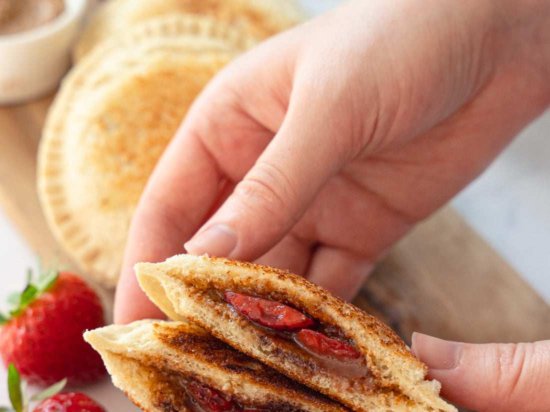 Use your fingers or a fork to gently crimp the two pieces of bread together, sealing them to form an “uncrustable.”