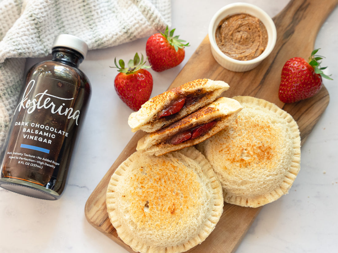 Spread the nut butter into a small circle inside each slice of sourdough. Top one slice with the strawberry and drizzle with Kosterina Dark Chocolate Balsamic. Top with the other slice.