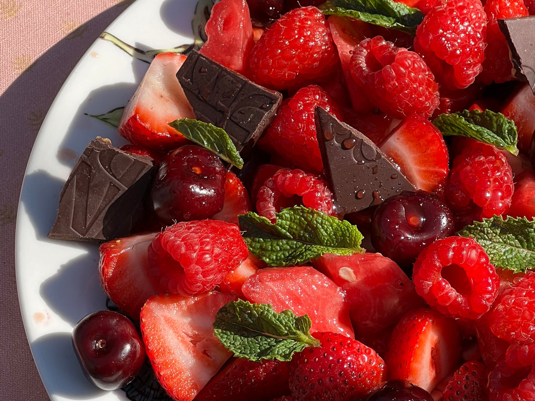 Arrange fruit on a plate, sprinkle with herbs and shards of chocolate.