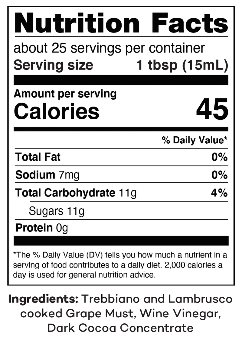 Trebbiano and Lambrusco cooked grape must, wine vinegar, dark cocoa concentrate