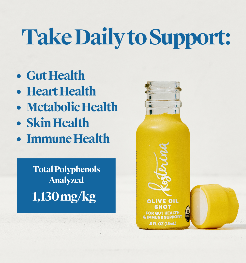 Polyphenols are powerful, naturally occurring antioxidants that support gut, metabolic, heart, skin, and immune health. Each shot has over 1,000 kg/mg of polyphenol content, 10x what you might find in an average EVOO.