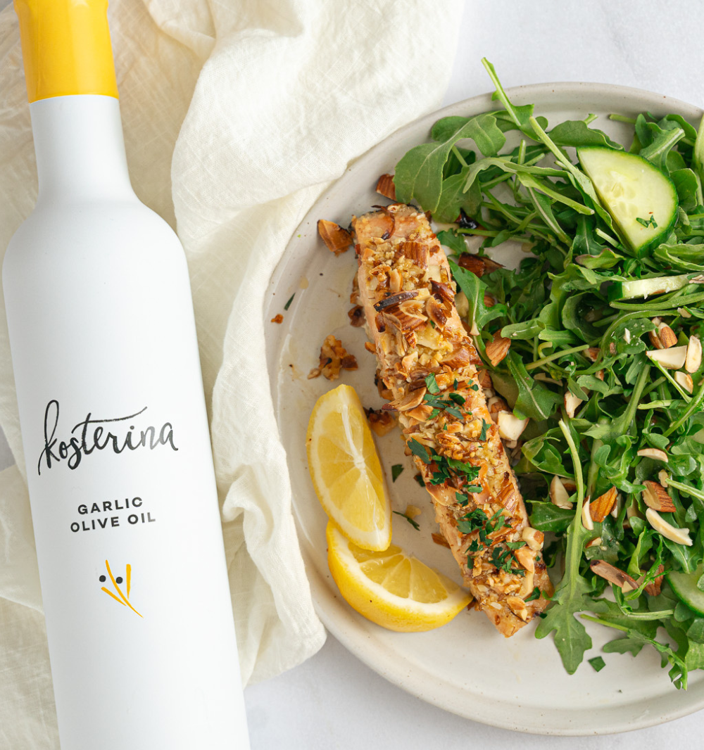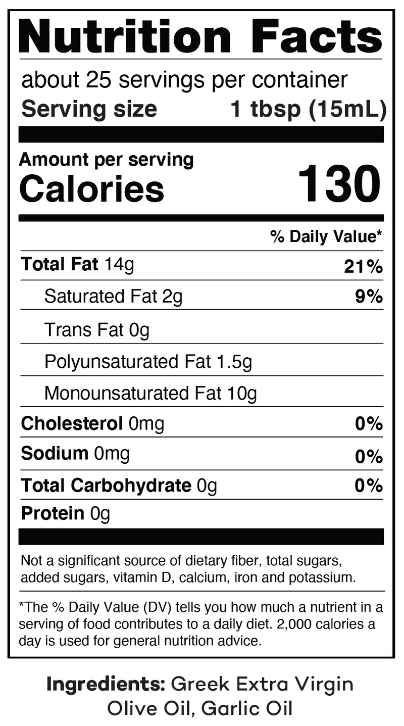 Our Garlic Olive Oil is packed with rich garlic taste and impressive health benefits. Each bottle starts with our 100% pure, ultra-premium extra virgin olive oil, which is cold-pressed from early harvest olives in southern Greece. We then add a dash of Mediterranean flavor with roasted garlic oil for an olive oil that will add complexity and depth to any dish.