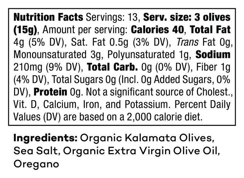 Organic Kalamata Olives, Sea Salt, Organic Extra Virgin Olive Oil, Organic Oregano