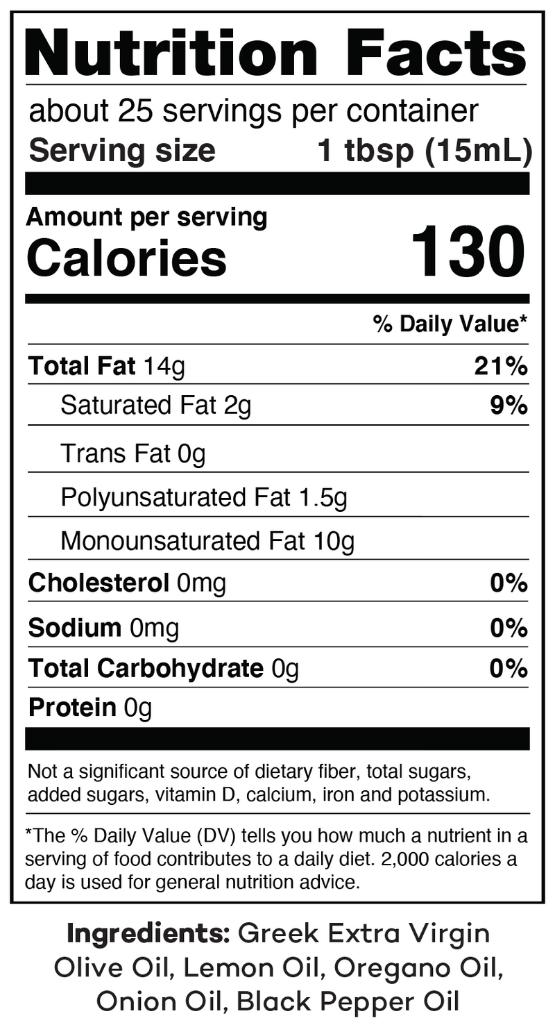 Greek extra virgin olive oil, lemon oil, oregano oil, onion oil, black pepper oil