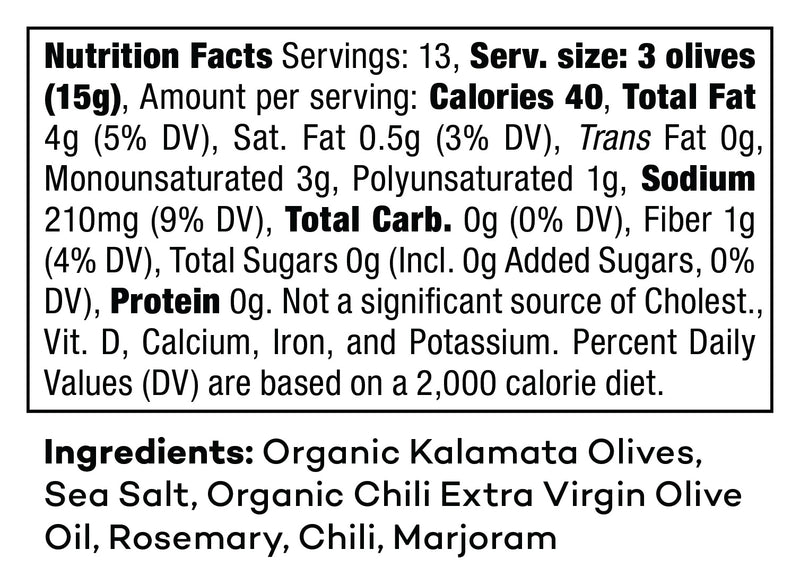 Organic Kalamata Olives, Sea Salt, Organic Chili Extra Virgin Olive Oil, Organic Rosemary, Organic Chili, Organic Marjoram